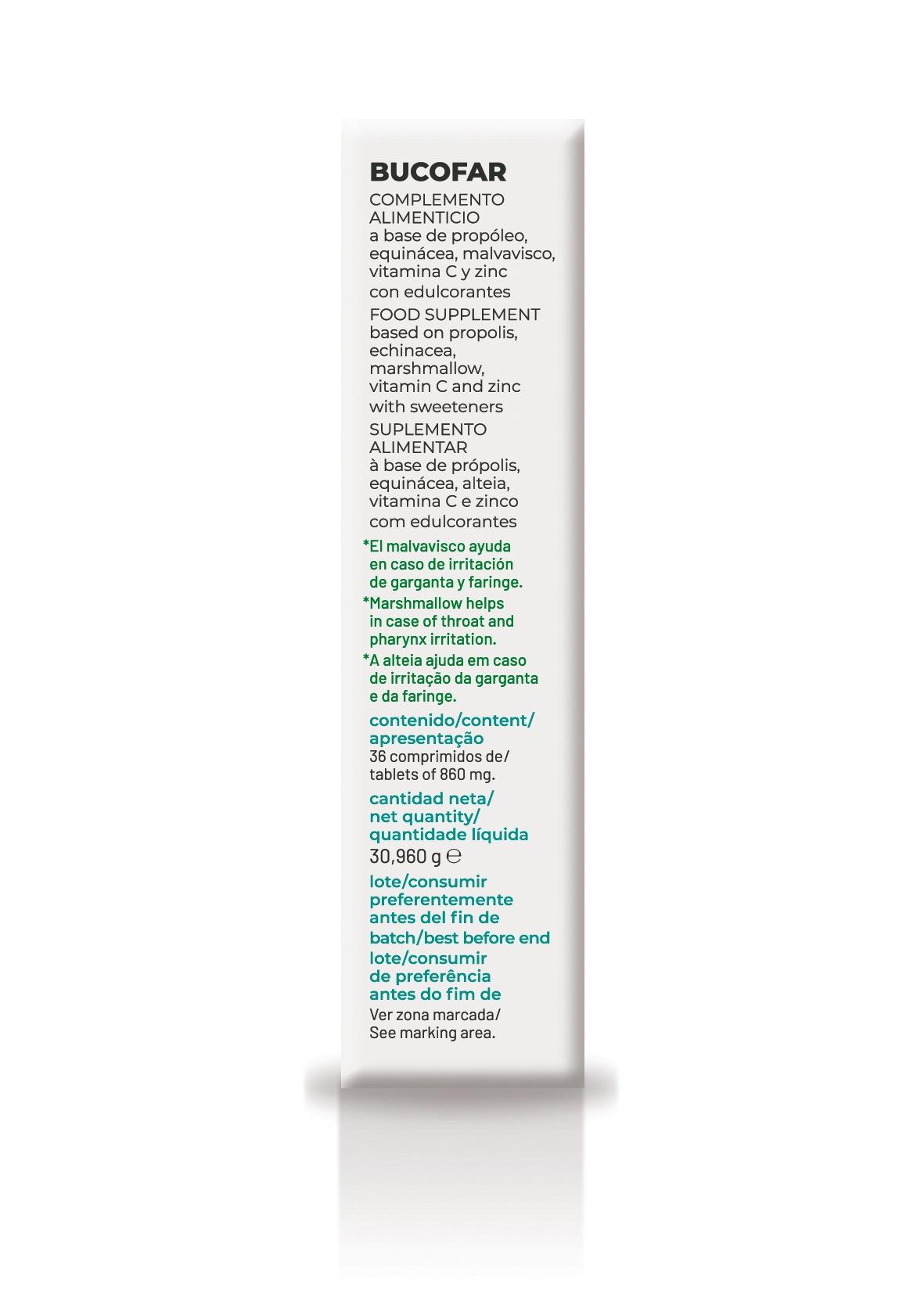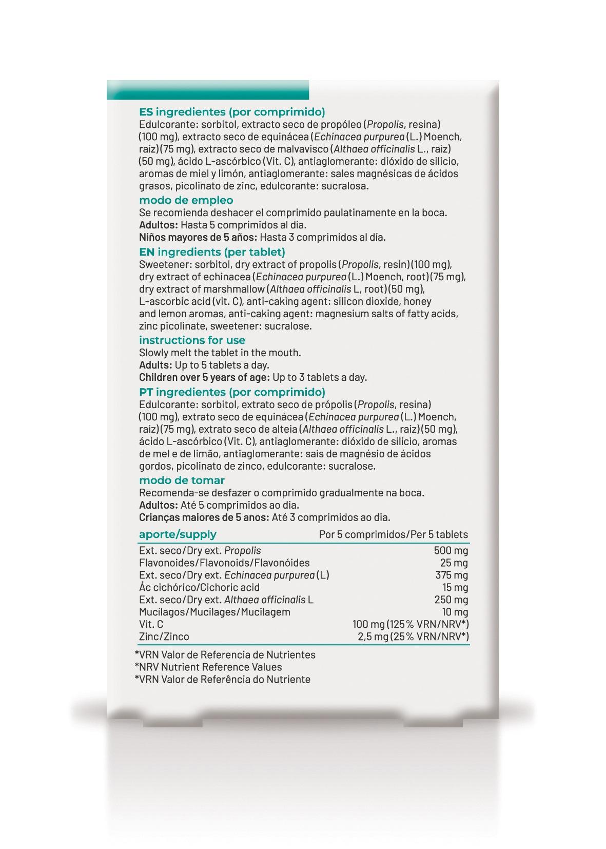 Per tablet: Sweetener: sorbitol, dry extract of propolis (Propolis, resin) (100 mg), dry extract of echinacea (Echinacea purpurea (L.) Moench, root) (75 mg), dry extract of marshmallow (Althaea officinalis L, root) (50 mg), L-ascorbic acid (Vit. C), anti-caking agent: silicon dioxide, honey and lemon aromas, anti-caking agent: magnesium salts of fatty acids, zinc picolinate, sweetener: sucralose.