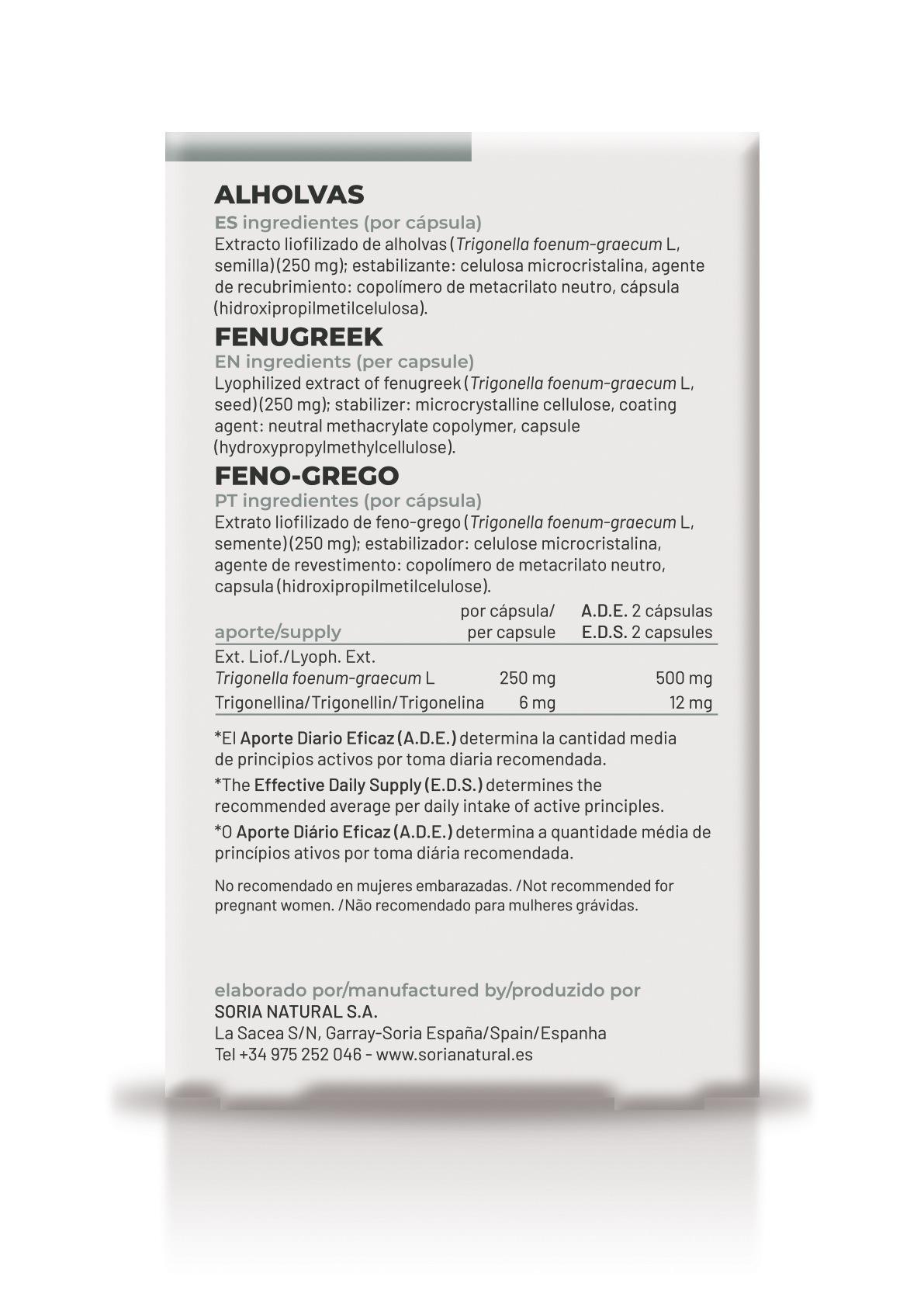 (por cápsula) extracto liofilizado de alholvas (Trigonella foenum-graecum L.) (semilla) (250 mg), estabilizante: celulosa microcristalina, agente de recubrimiento: copolímero de metacrilato neutro, cápsula (hidoxipropilmetilcelulosa).