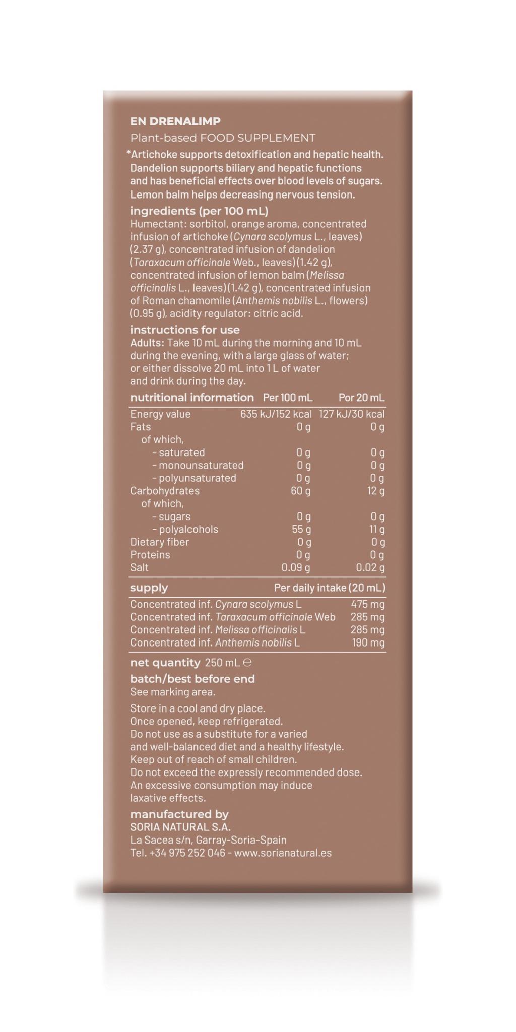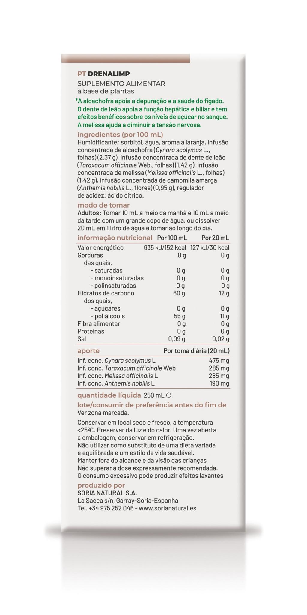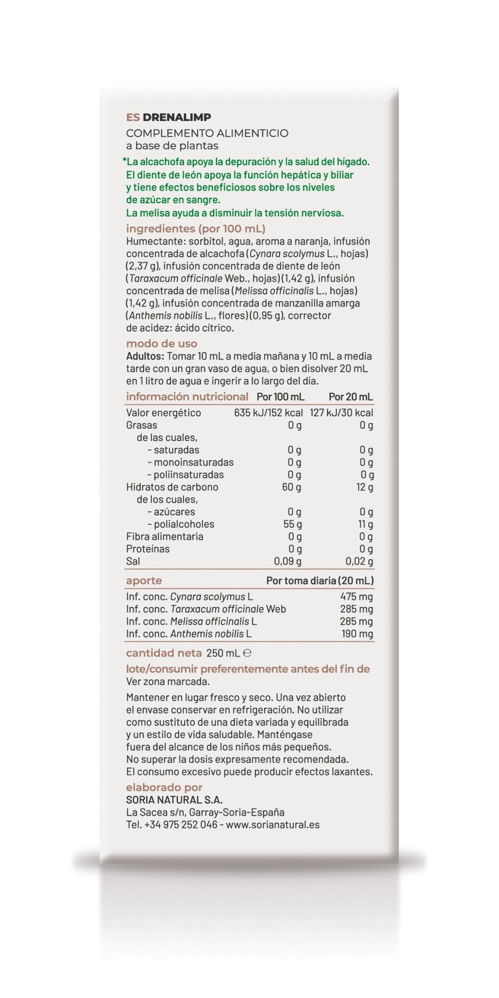 Por 100ml: Humectante: sorbitol, agua, aroma a naranja, infusión concentrada de alcachofa (Cynara scolymus L. /hojas) (2,37 g), infusión concentrada de diente de león (Taraxacum officinale Weber/hojas) (1,42 g), infusión concentrada de melisa (Melissa officinalis L./hojas) (1,42 g), infusión concentrada de manzanilla amarga (Anthemis nobilis L, flores) (0,95 g), corrector de acidez: ácido cítrico.
