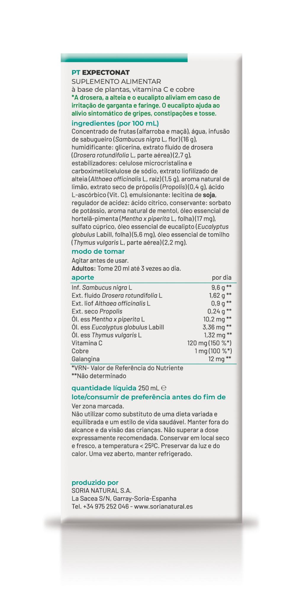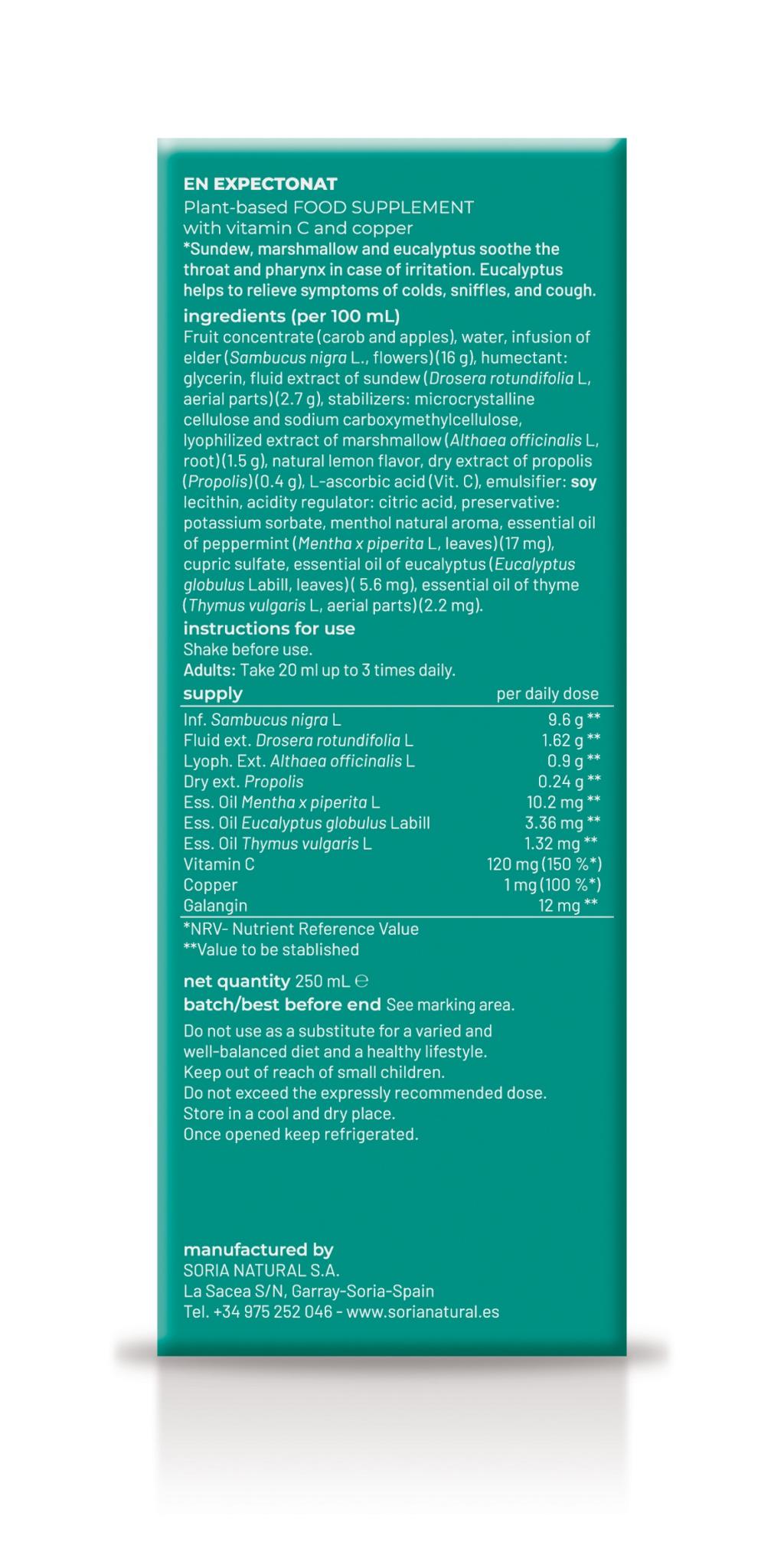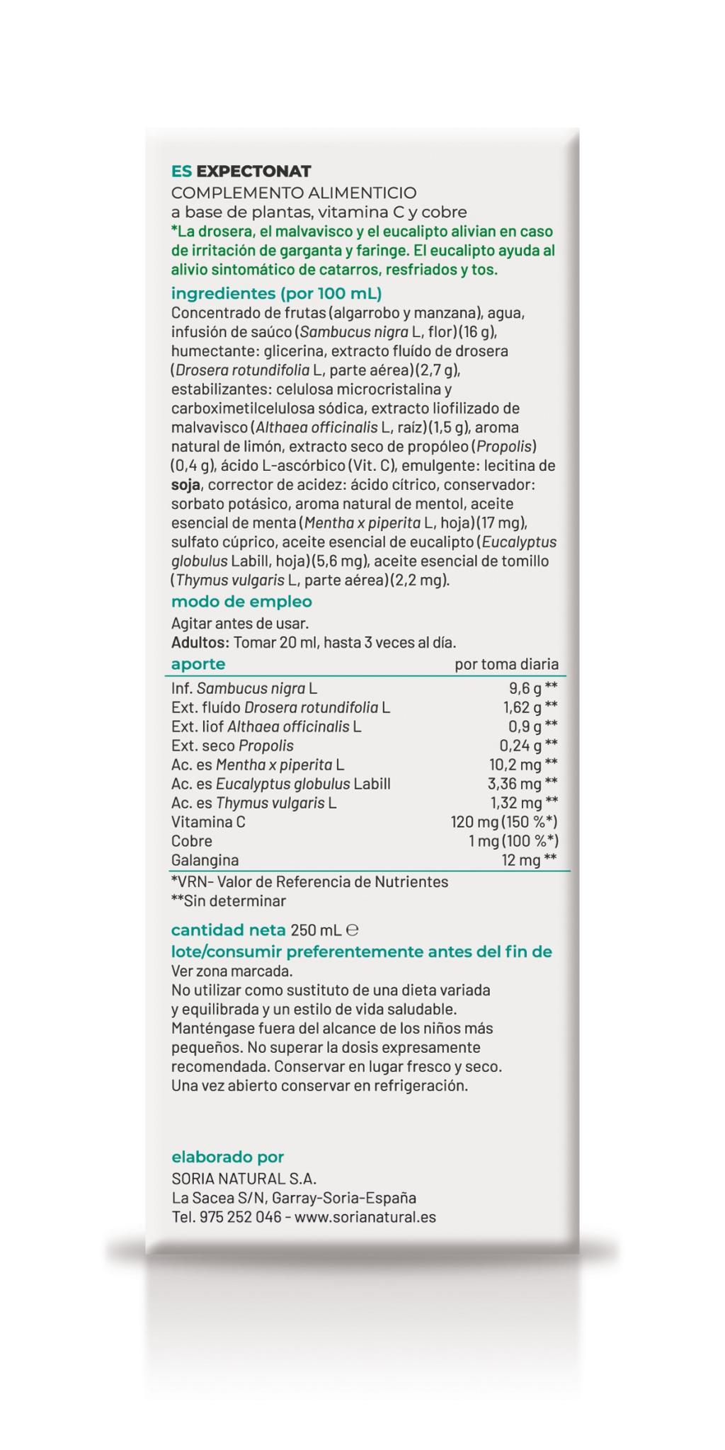 (por 100 ml) Concentrado de frutas (algarrobo y manzana), agua, infusión de saúco (Sambucus nigra L, flor) (16 g), humectante: glicerina, extracto fluído de drosera (Drosera rotundifolia L, parte aérea) (2,7 g), estabilizantes: celulosa microcristalina y carboximetilcelulosa sódica, extracto liofilizado de malvavisco (Althaea officinalis L, raíz) (1,5 g), aroma natural de limón, extracto seco de propóleo (Propolis) (0,4 g), ácido L-ascórbico (Vit. C), emulgente: lecitina de soja, corrector de acidez: ácido cítrico, conservador: sorbato potásico, aroma natural de mentol, aceite esencial de menta (Mentha x piperita L, hoja) (17 mg), sulfato cúprico, aceite esencial de eucalipto (Eucalyptus globulus Labill, hoja) (5,6 mg), aceite esencial de tomillo (Thymus vulgaris L, parte aérea) (2,2 mg).