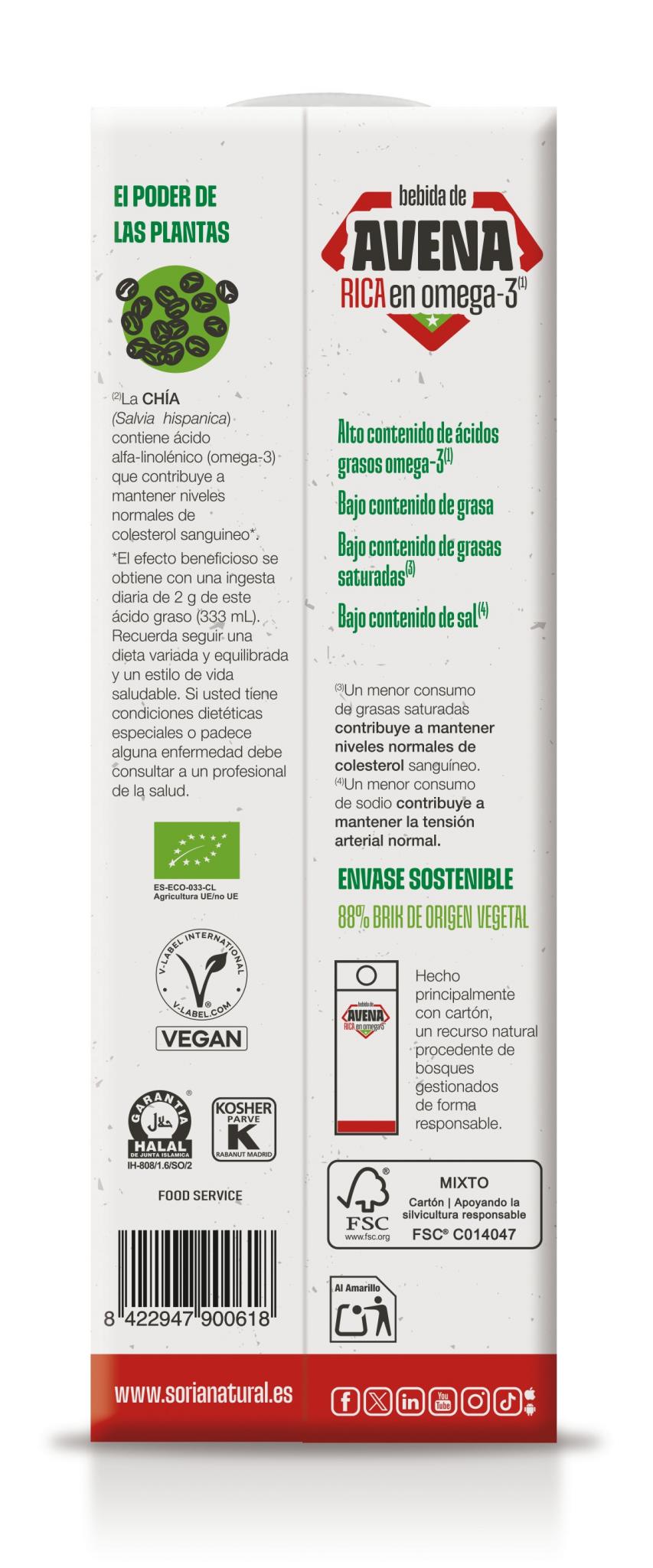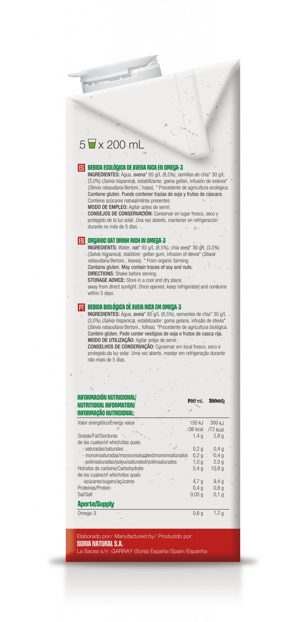 Água, aveia* 85 g/L (8,5%), sementes de chia* 30 g/L (3,0%) (Salvia hispanica), estabilizante: goma gellan, infusão de estévia* (Stevia rebaudiana Bertoni., folhas). *Proveniente da agricultura biológica. Contém glúten. Pode conter vestígios de soja e frutos de casca rija. Contém açúcares naturalmente presentes.