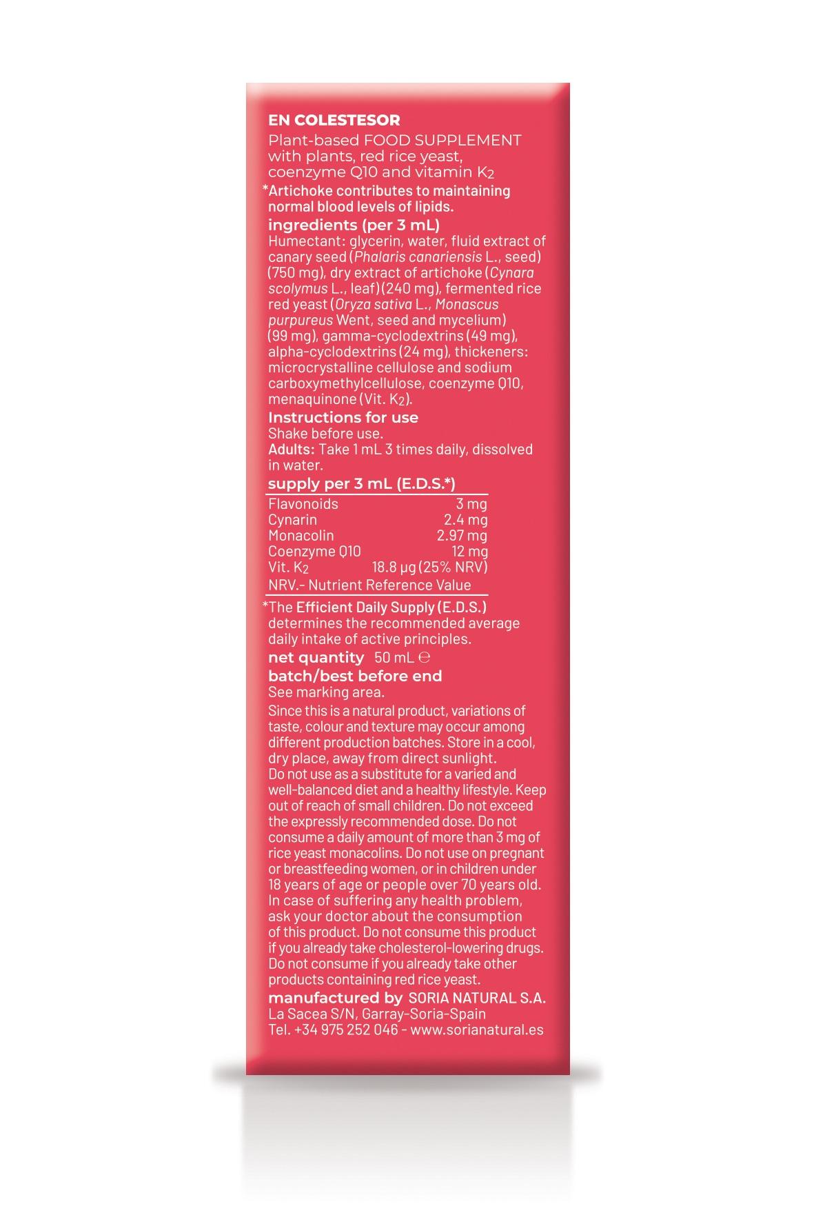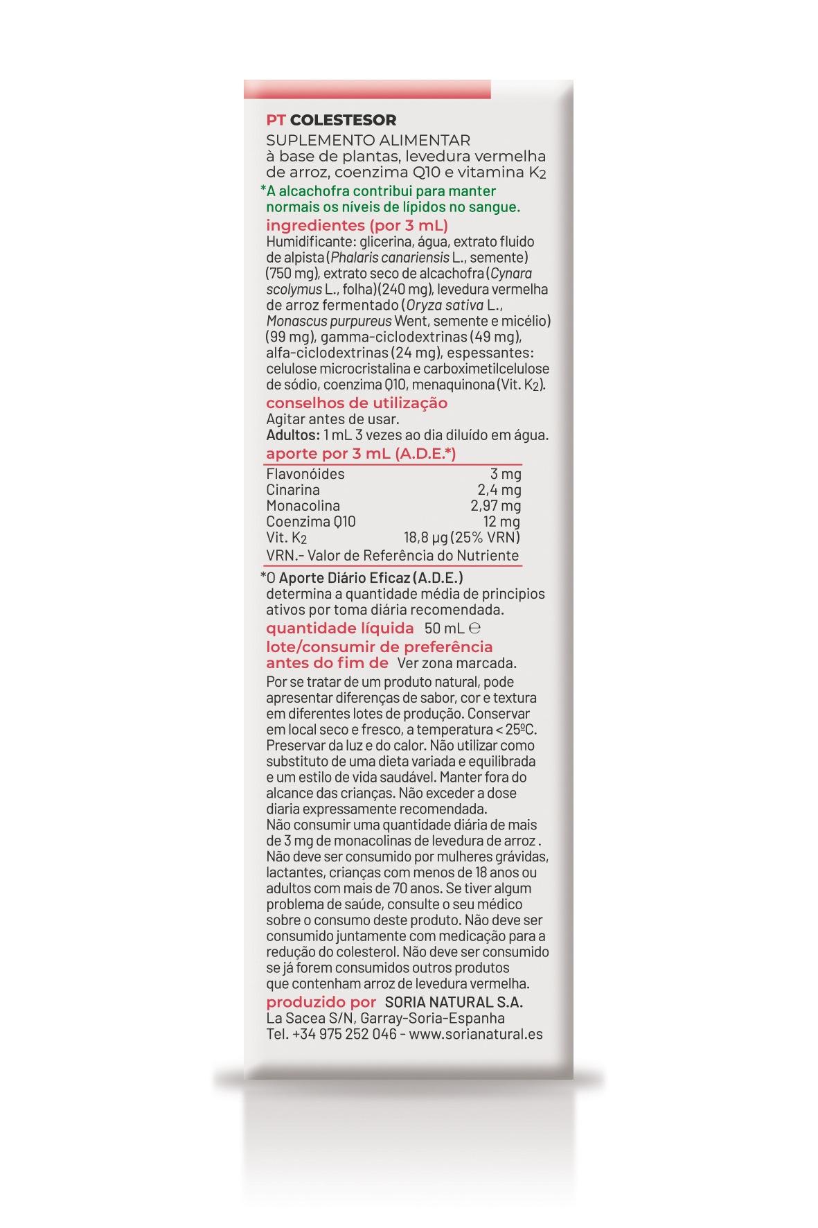 Por 3 mL: Hidratante: glicerina, água, extrato fluido de alpiste (Phalaris canariensis L, semente) (750 mg), extrato seco de alcachofra (Cynara scolymus L, folha) (240 mg), levedura vermelha de arroz fermentado (Oryza sativa L, Monascus purpureus Went, semente e micélio) (99 mg), gama-ciclodextrinas (49 mg), alfaciclodextrinas (24 mg), espessantes: celulose microcristalina e carboximetilcelulose sódica, coenzima Q10, menaquinona (Vit K2).